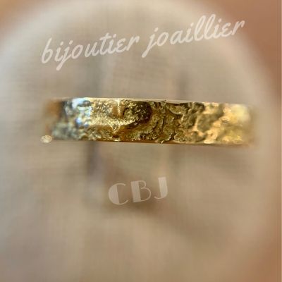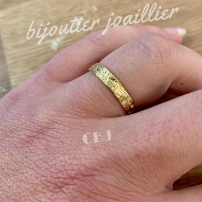 Voici une alliance toute simple, avec un effet de matière sur le dessus puisqu'il s'agit d'une empreinte d'écorce. Cette bague fait 4 mm de largeur, elle est en or jaune 750 millièmes et pèse 2,37 grammes. Alors pour une demande en mariage, pour le jour "J" ou juste pour offrir, n'hésitez pas à passer commande. La taille des bagues peut être ajuste, aussi contactez nous par mail (cbjbijoutier@gmail.com) pour commander votre taille.