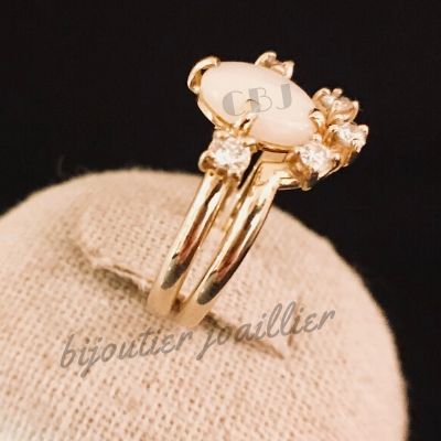 Ce bijou est composée de deux bagues : l'une avec deux diamants de 0,10 ct chacun et une opale de 0,90 ct serti griffes, pour un poids d'or de 1,85 gr. Sur la deuxième bague trois diamants de 0,10 ct chacun, serti griffes, poids d'or 1,77 gr. Poids total du bijoux 3,62 gr. La taille des bagues peuvent être ajusté alors contacter nous par mail (cbjbijoutier@gmail.com) pour commander votre taille.